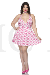 3 PC. includes: Plus size white and pink checkered print plunge neck halter dress, matching belt, and ruffled choker