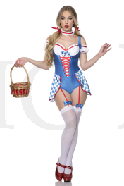 3 PC. includes: Corset style contrast trim teddy bodysuit with a white ruffled bust attached garters and checkered print overlay, ruffle choker, and hair ties
