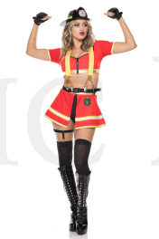 7 PC. includes: Metallic trim front zip crop top and skirt with firefighter emblem and tape detailing, suspenders, garter, belt, gloves, and firefighter hat
