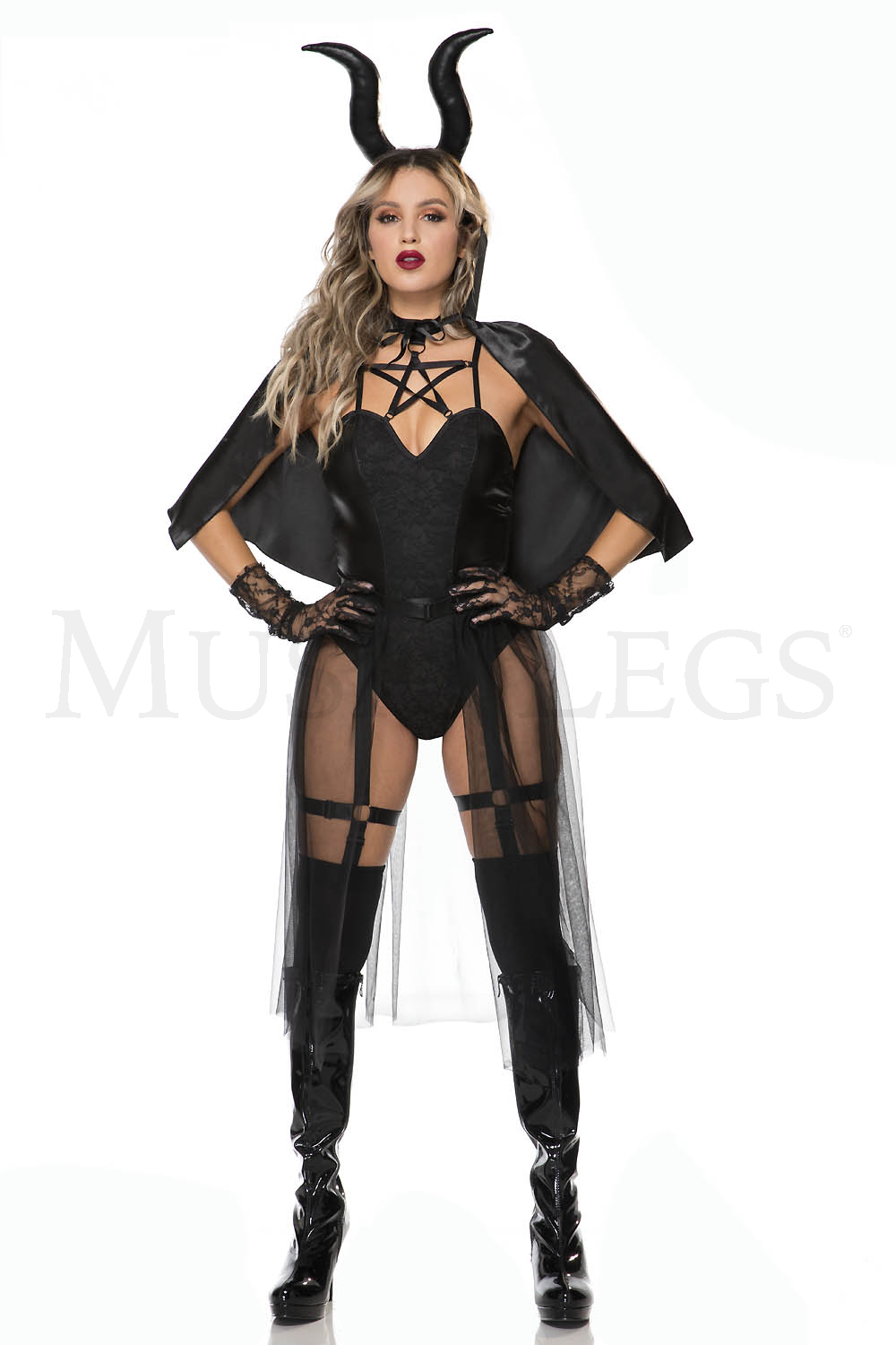 6 PC. includes: Black teddy bodysuit with pentagram and contrast lace detail, mesh skirt overlay, leg garters, gloves, horn headband, and cape