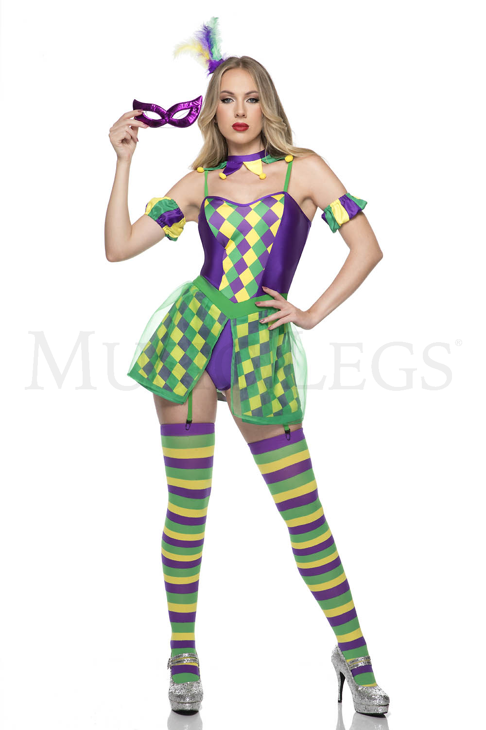 5 PC. include: Multi-color contrast checker print split front dress with attached garters & green mesh tulle overlay, striped armbands, headpiece, choker & mask