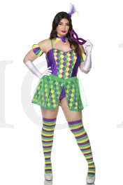 5 PC. includes: Plus size multi-color contrast checker print split front dress with attached garters and green mesh tulle overlay, striped armbands, headpiece, choker, and mask (gloves not included)