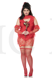 5 PC. includes: Plus size sleeveless red bodysuit with ruffled lace trim and sheer skirt overlay, choker, headpiece, gloves, and bow garter