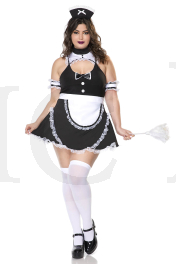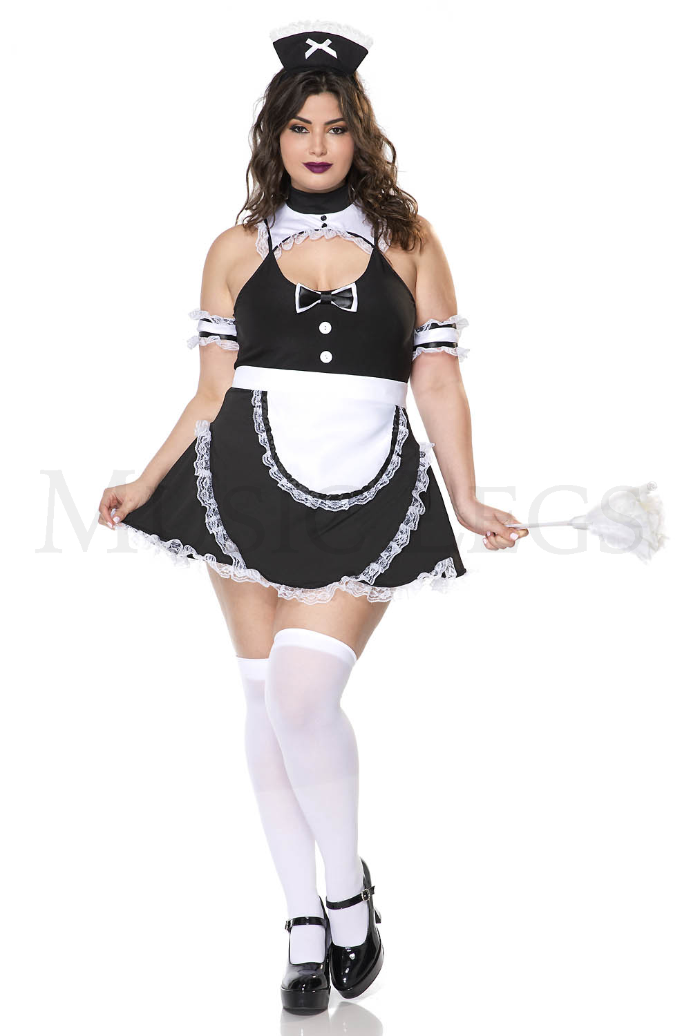 5 PC. includes: Plus size black scoop neck mini dress with bow accent lace choker and decorative front buttons, lace trim apron, headpiece, ruffled armbands, and feather duster