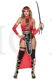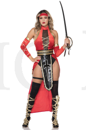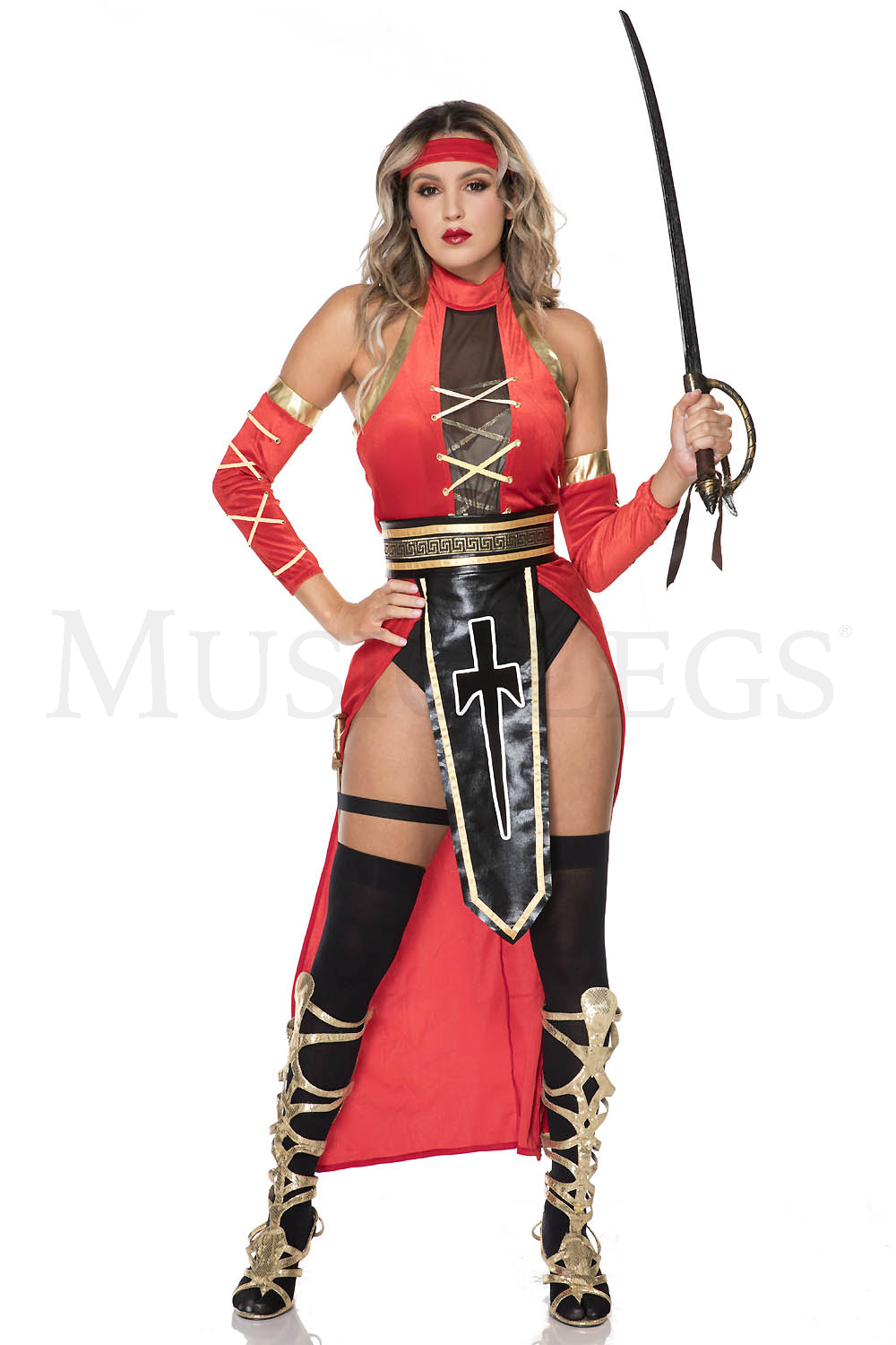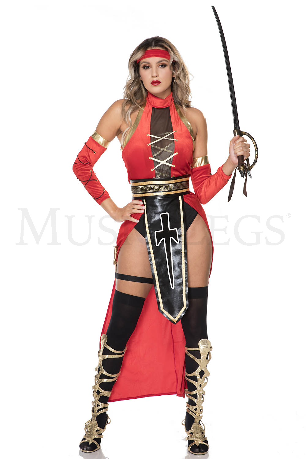 6 PC. includes: Lace-up detail dress with contrast metallic trim and sheer mesh panel, shorts, Greek-style warrior belt, armbands, headband, and leg garter