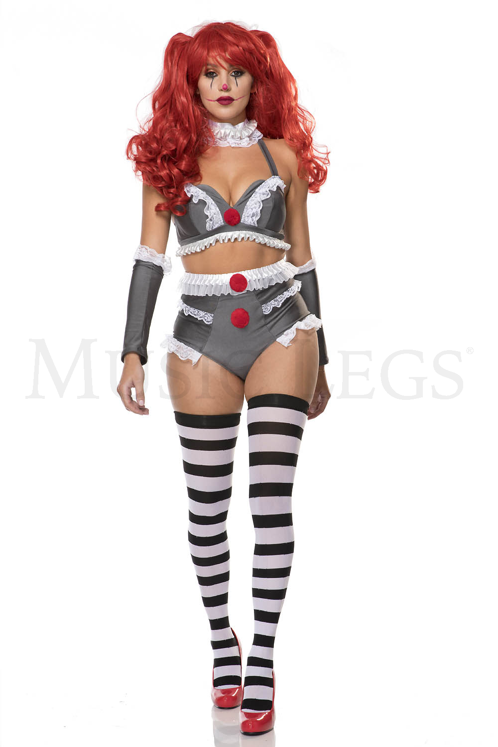 4 PC. includes: Gray plunge neck crop top and matching shorts with white ruffled lace trim and red pom pom accents, choker, and armbands