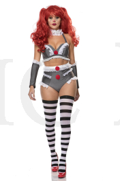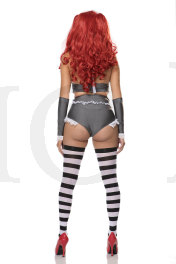 4 PC. includes: Gray plunge neck crop top and matching shorts with white ruffled lace trim and red pom pom accents, choker, and armbands