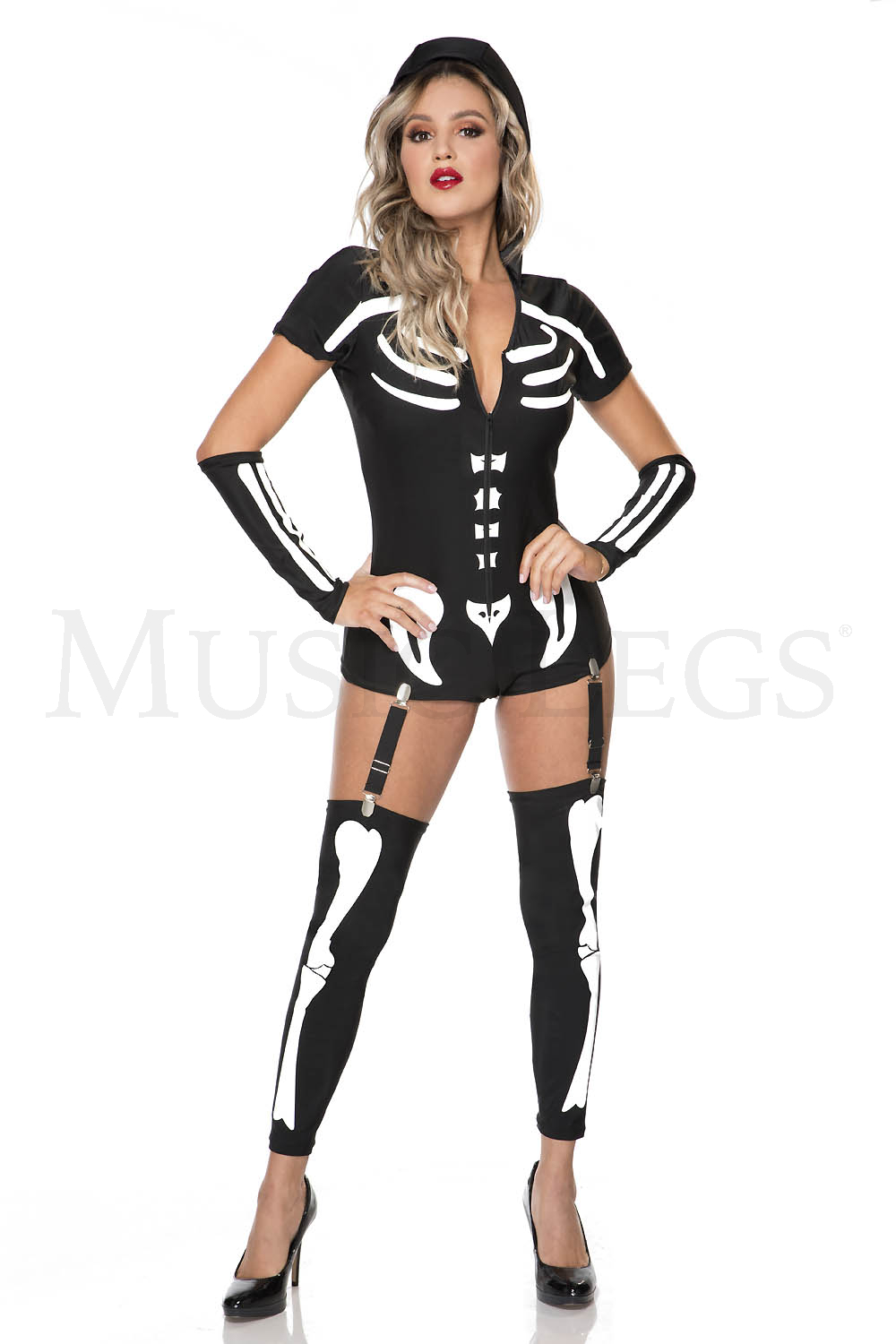3 PC. includes: Short sleeve front zip skeleton print romper with attached garters, matching thigh hi, and armbands