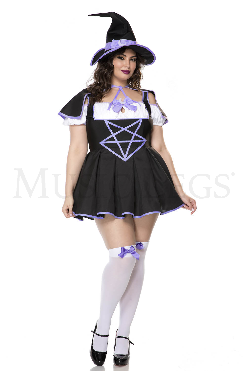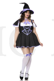 4 PC. includes: Plus size pentagram graphic pleated mini dress with bow accent and contrast trim, cape, witch?s hat, and ribbon