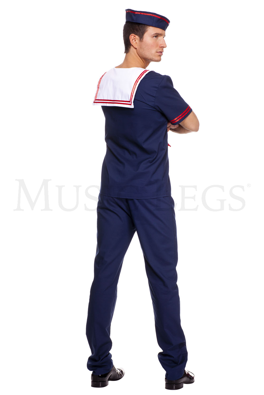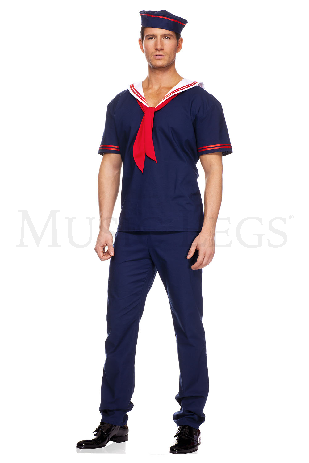 The Mens Ahoy Sailor Costume is a three piece set that features a navy blue white collared shirt with red scarf along with matching pants and hat.