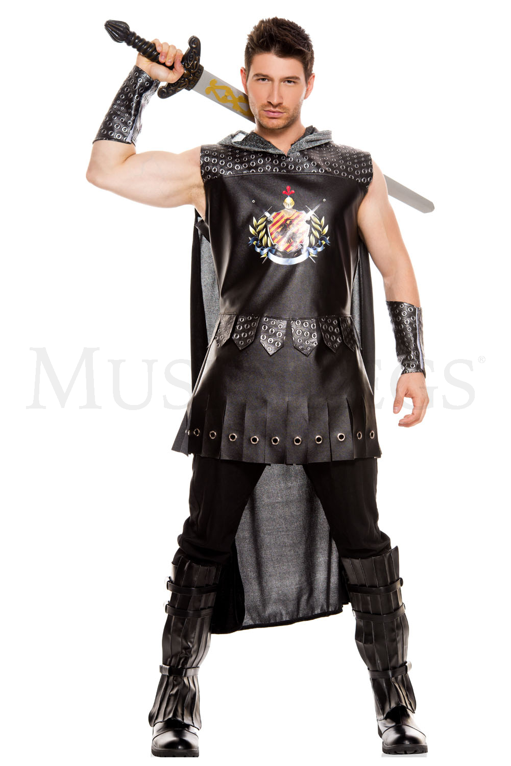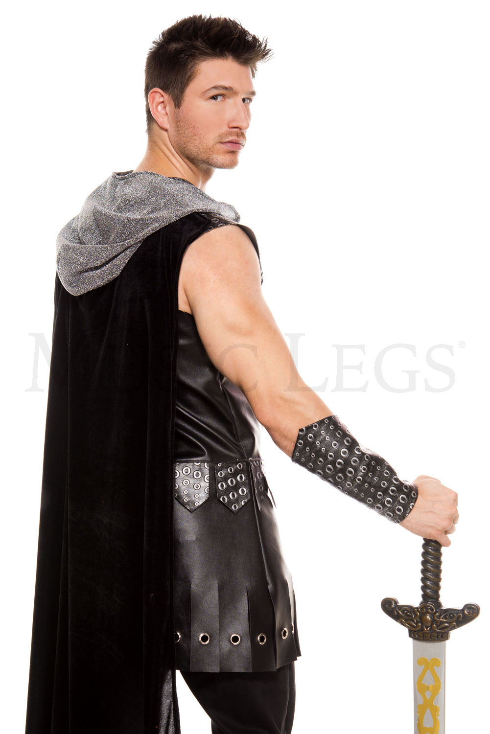 The Mens Medieval Warrior King costume features the metallic print tunic, matching gauntlets and black cape. (Sword not included.)