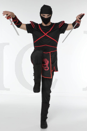 5 PC. includes: Black with red trim top, black pants, armbands, hat, and scarf (sword not included)