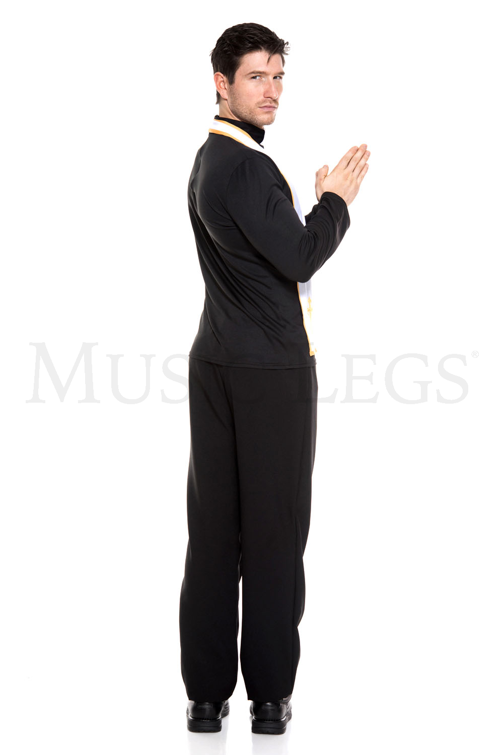 Comfort others in this Men's Religious Priest costume featuring black priest shirt with white collar, gold trimmed satin scarf with cross details, and cross.