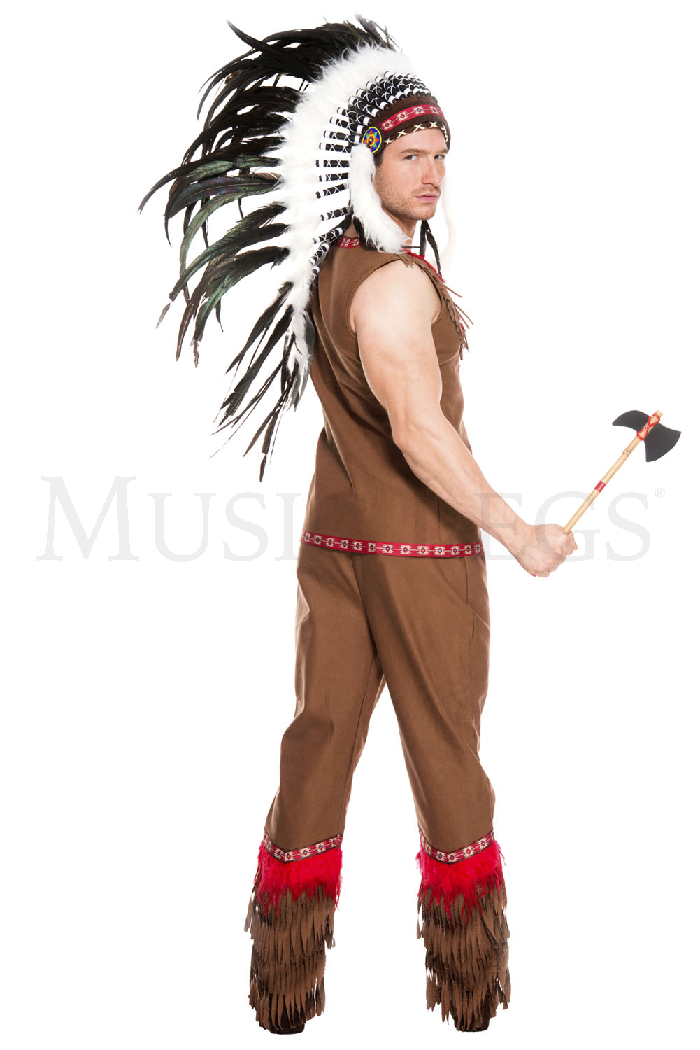 The four piece Men's Native American Chief costume includes a faux fur with fringe top, matching pants, arm band, and toy tomahawk. (Headdress not included.)