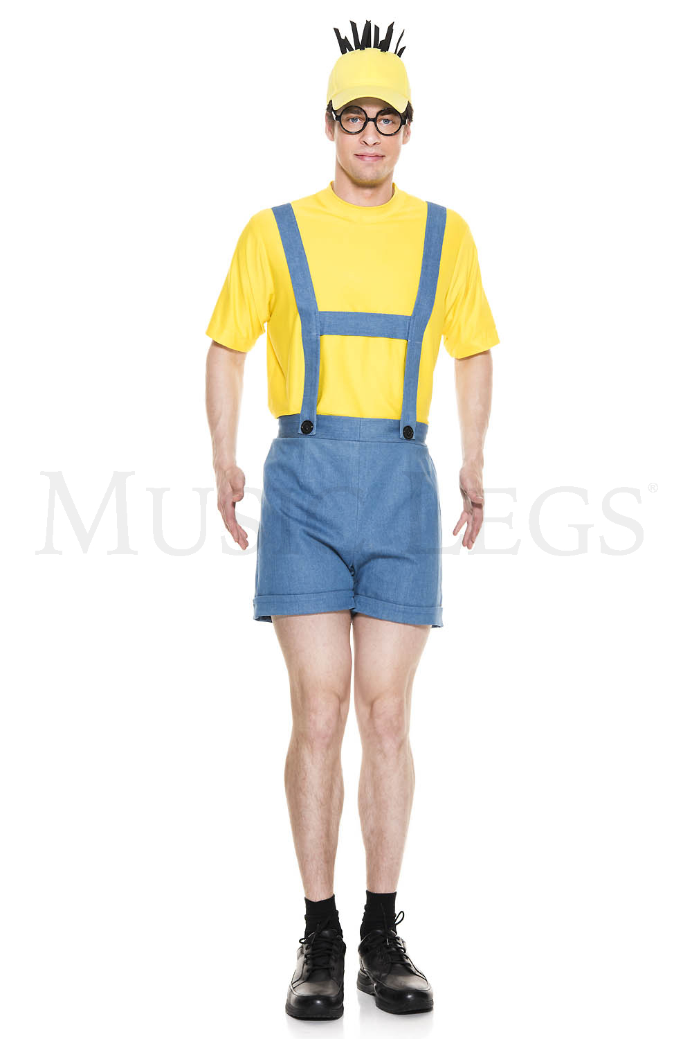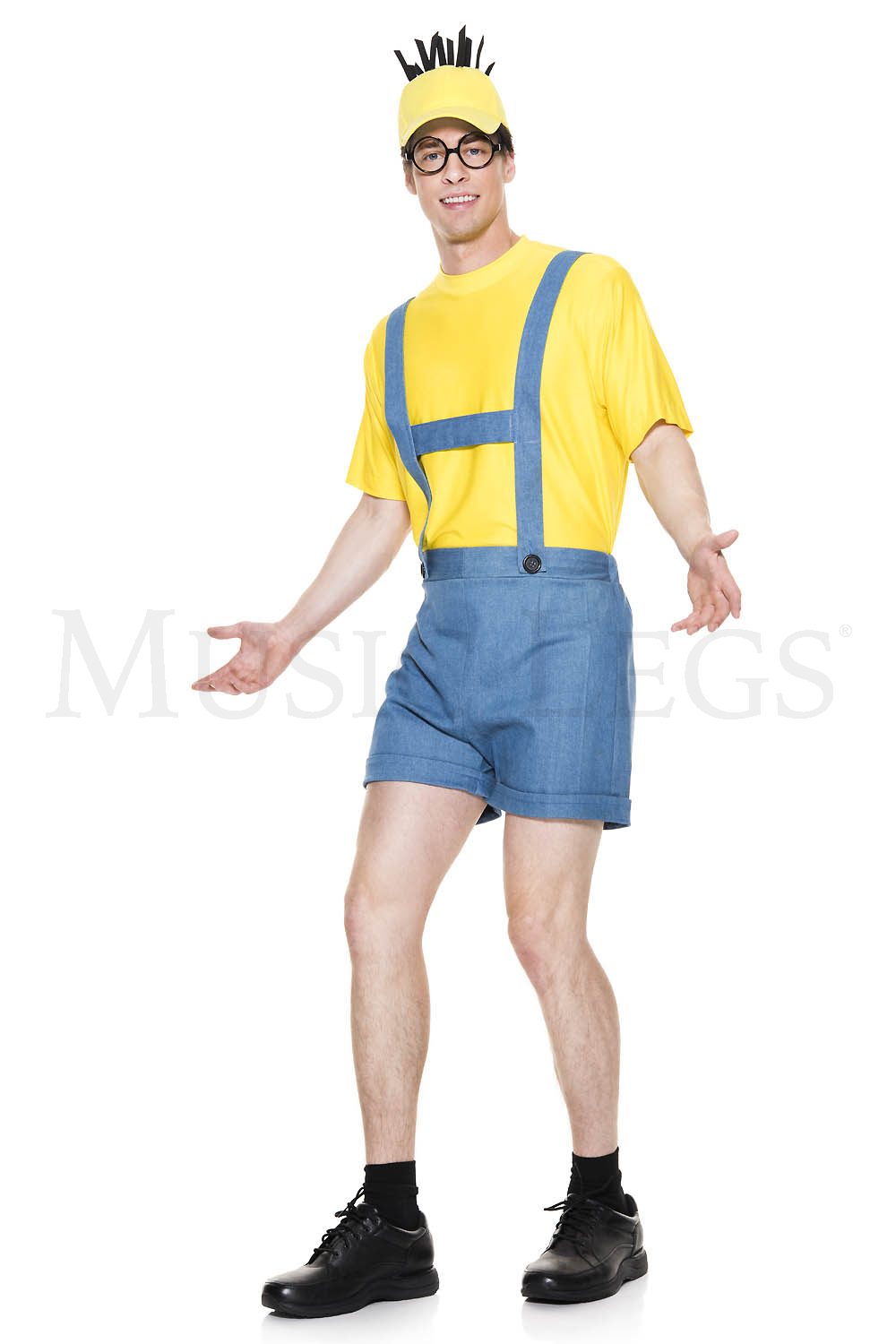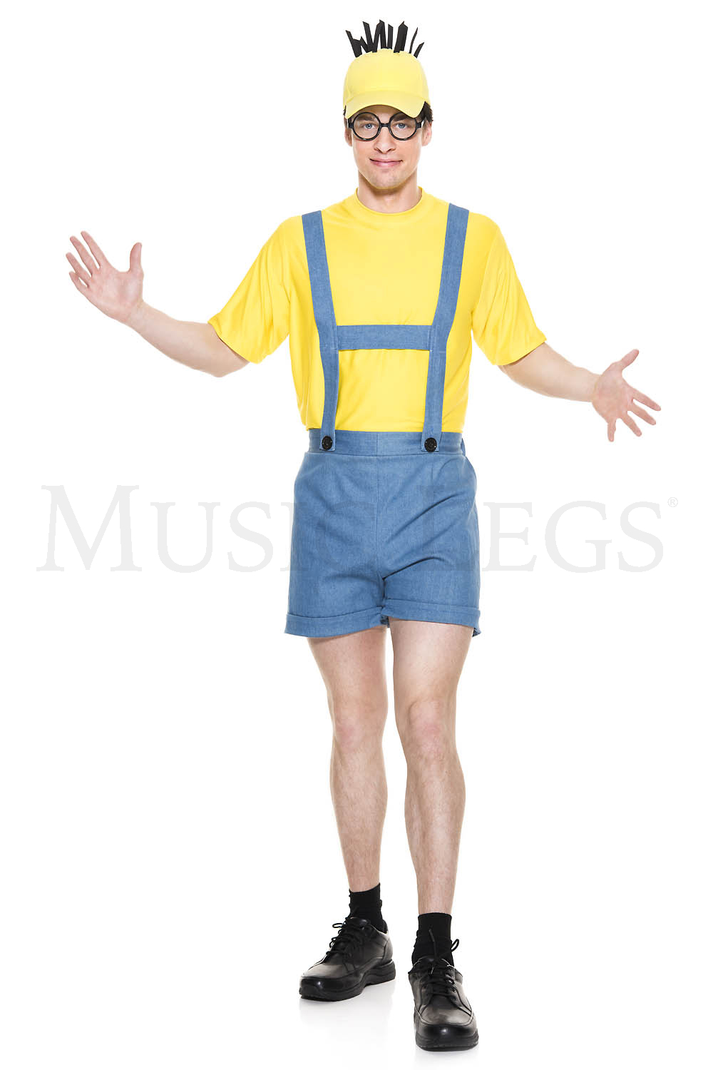 NEW! 4 PC. includes: Denim blue short overalls, yellow short sleeve shirt, hat, and glasses