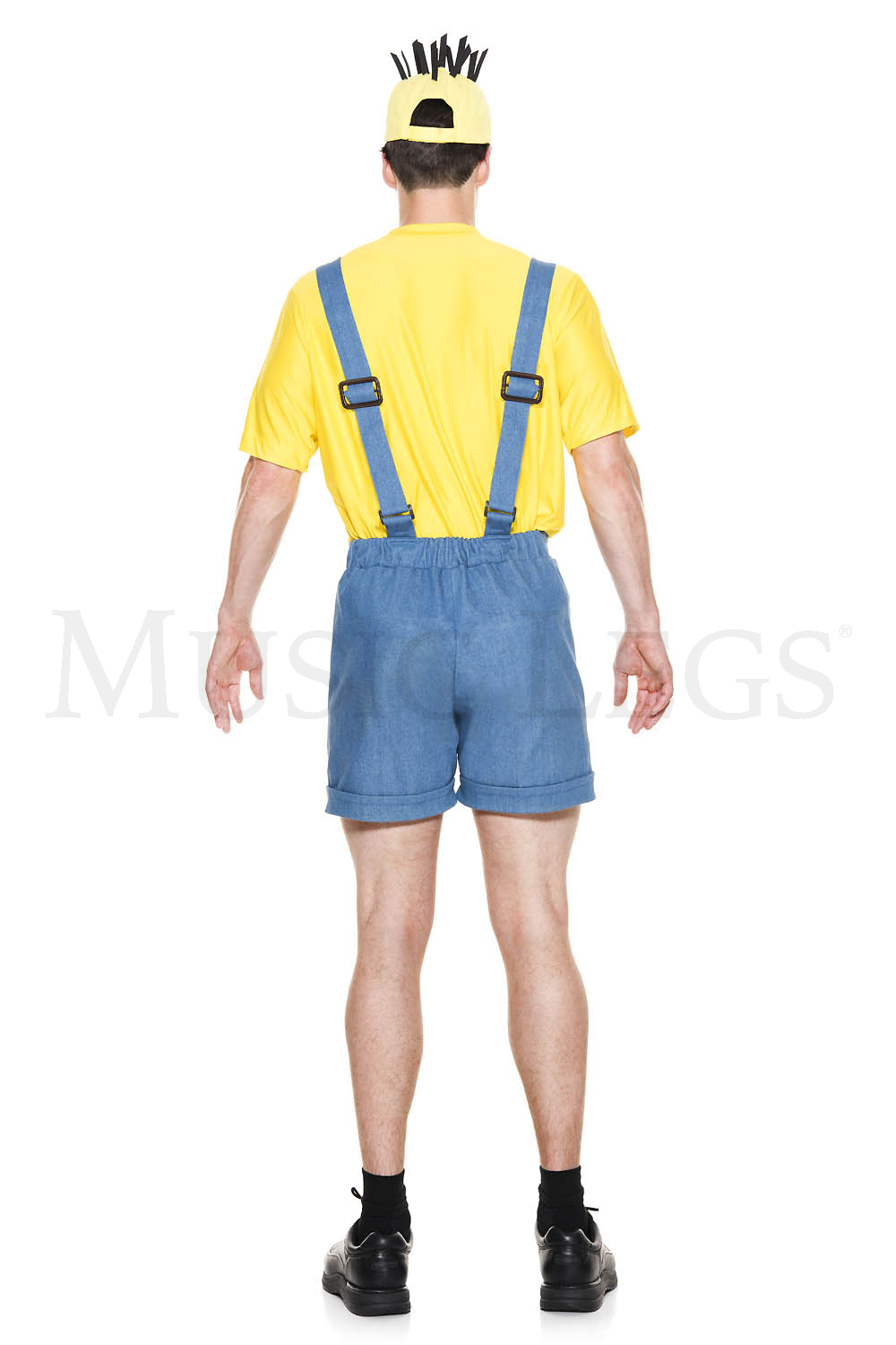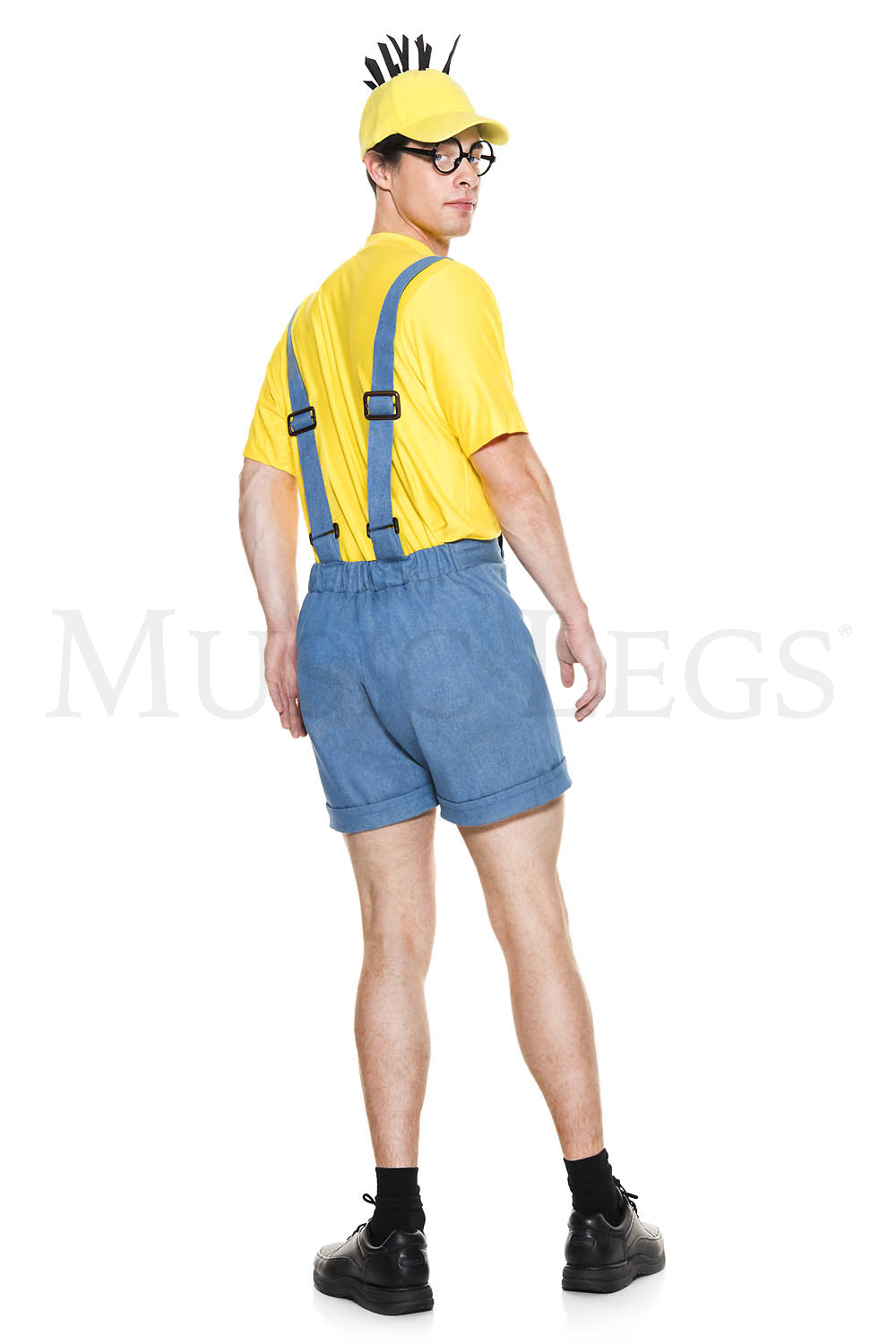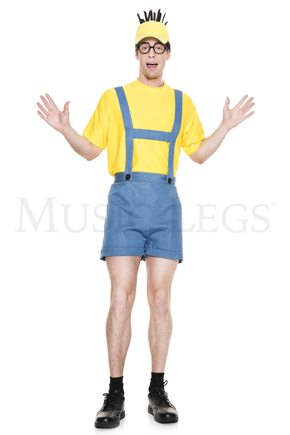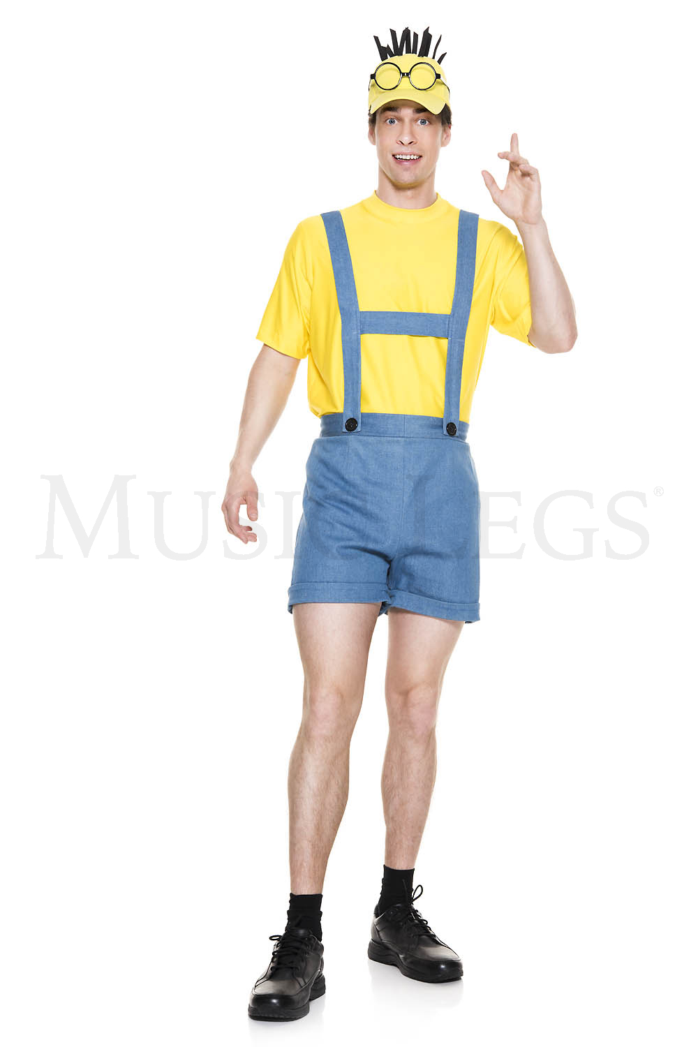 NEW! 4 PC. includes: Denim blue short overalls, yellow short sleeve shirt, hat, and glasses