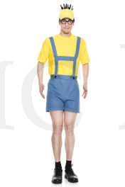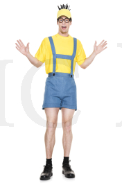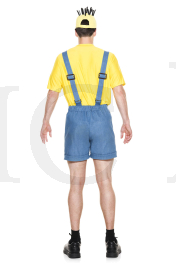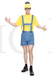 NEW! 4 PC. includes: Denim blue short overalls, yellow short sleeve shirt, hat, and glasses