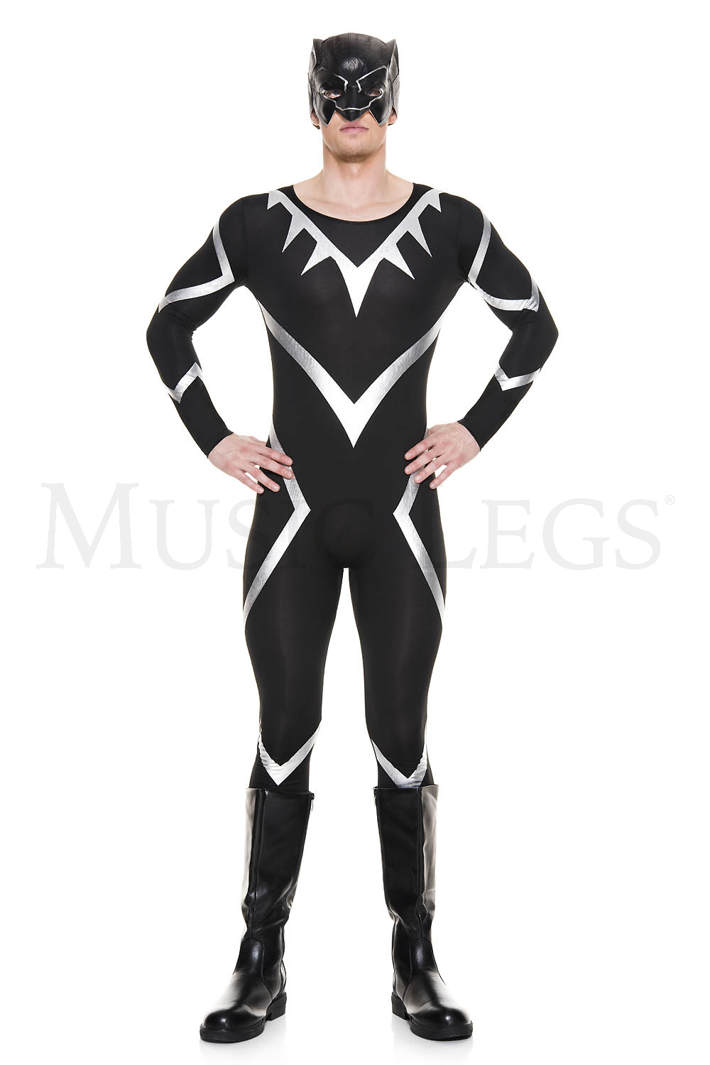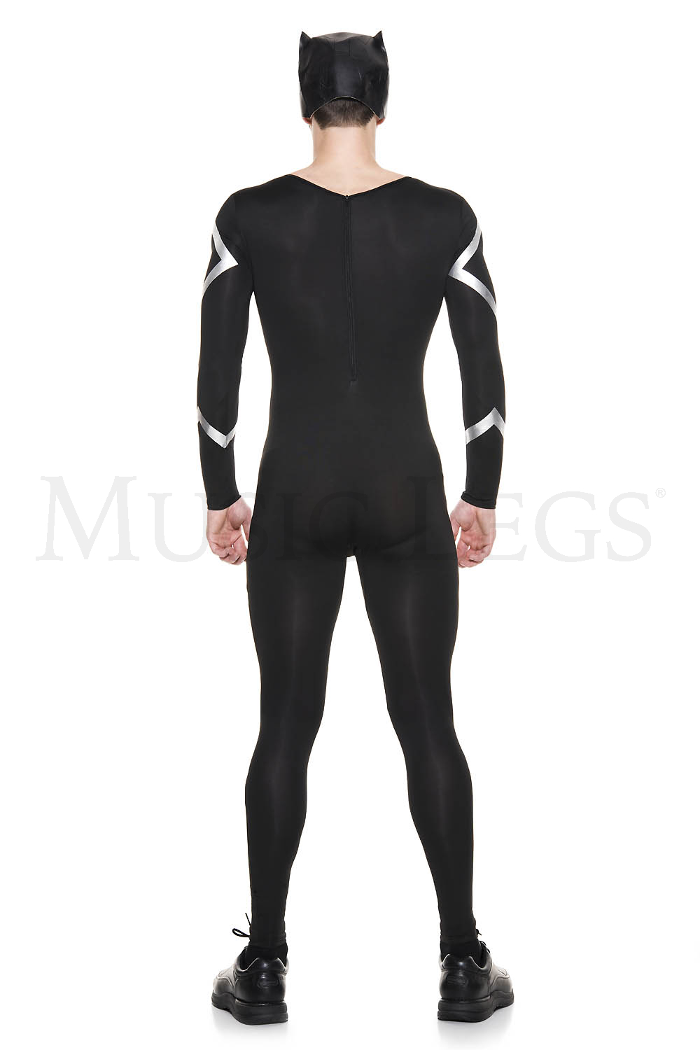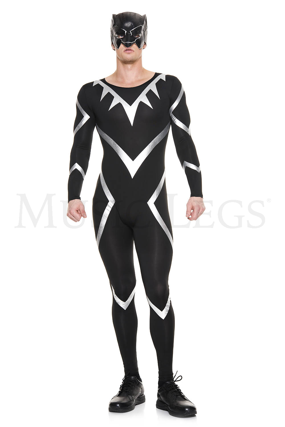 2 PC. includes: Long sleeve bodysuit with metallic details and mask