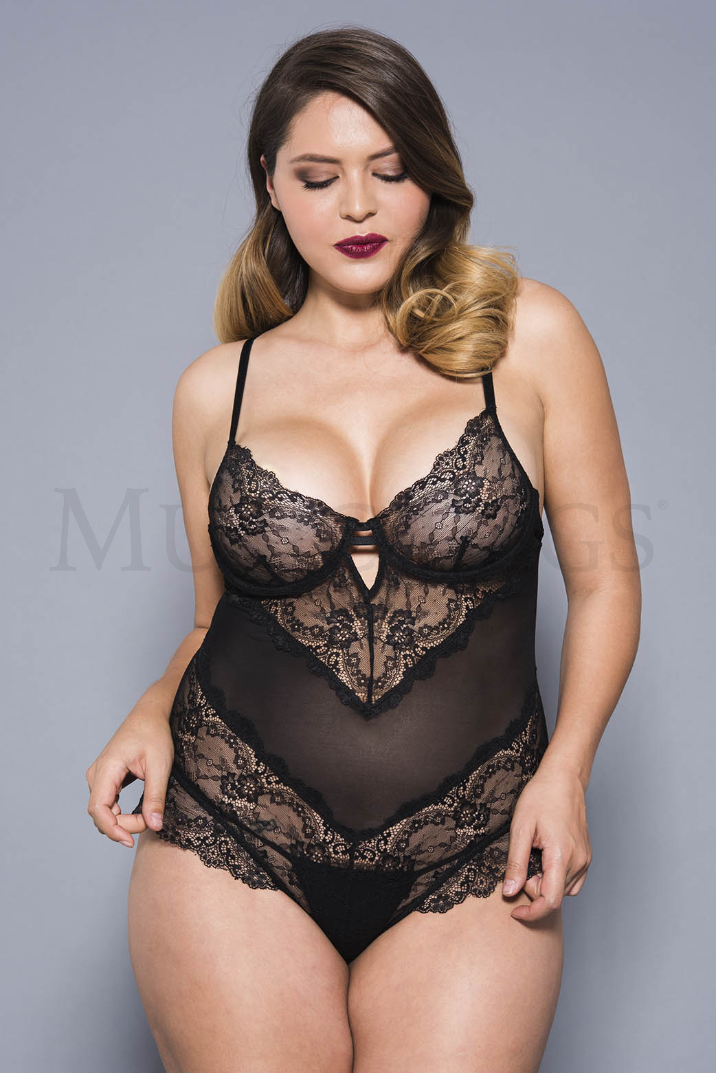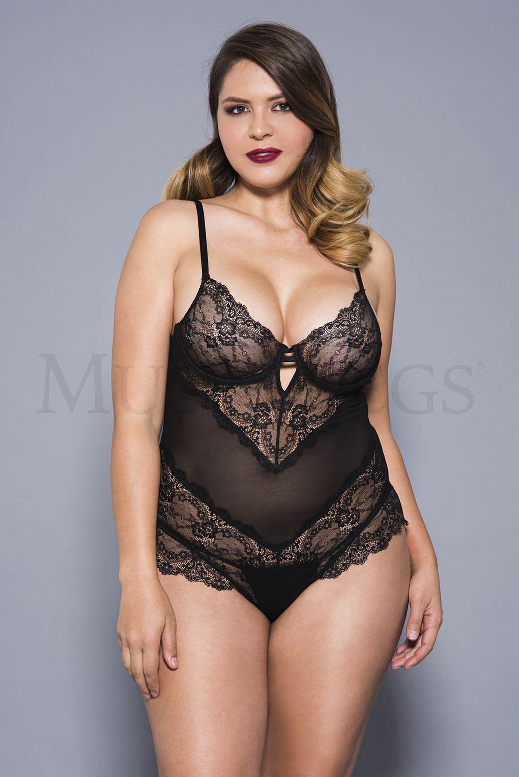 Plus size flower lace and back mesh teddy with underwire cups (G-string not included)