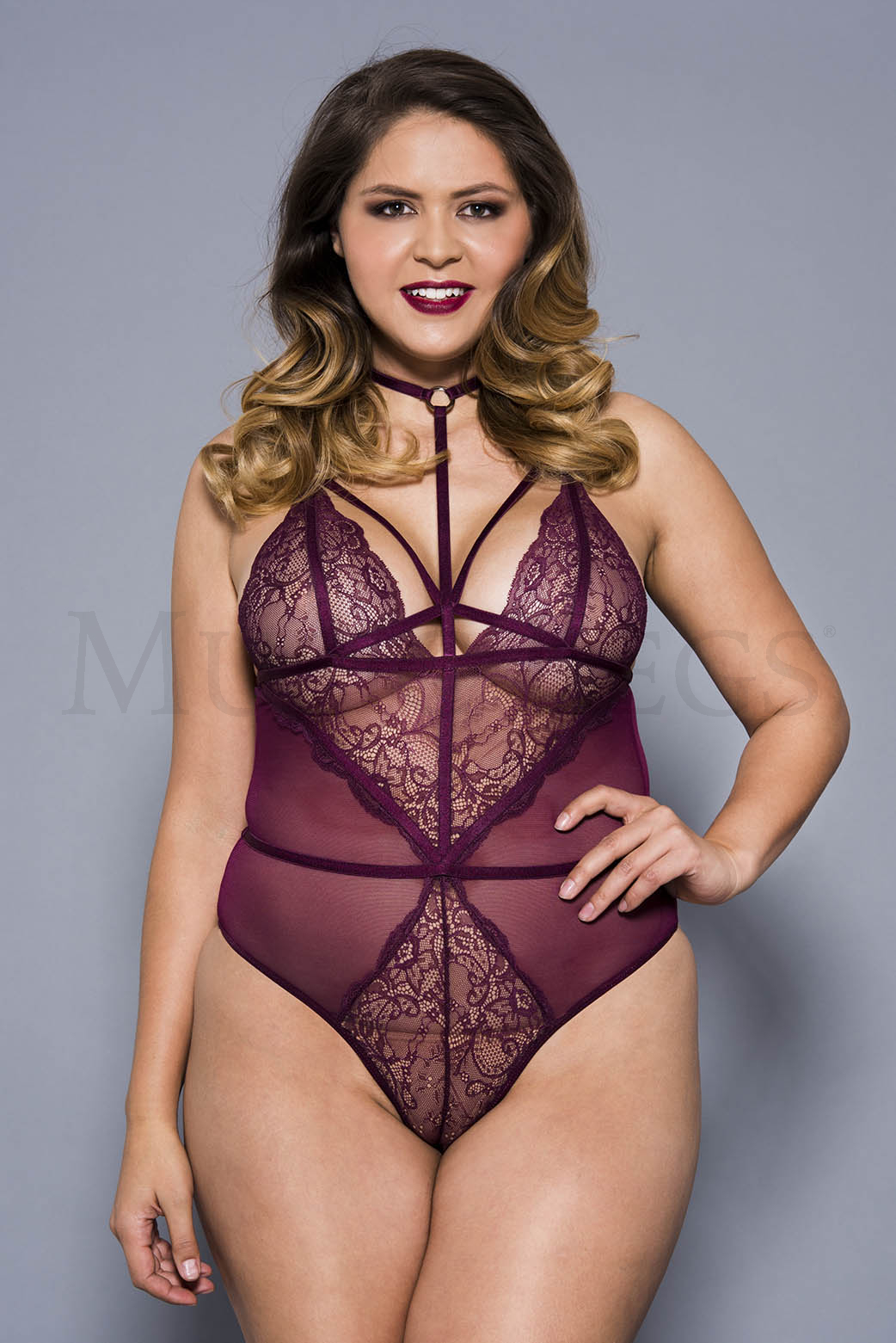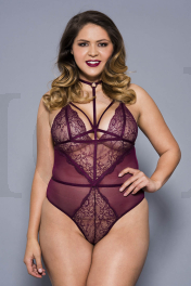 Plus size high neck scalloped trim lace teddy with sheer back (G-string not included)