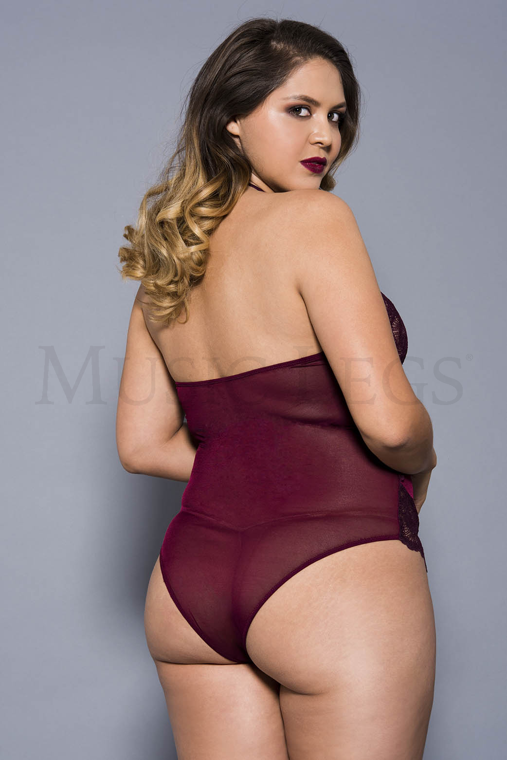 Plus size high neck scalloped trim lace teddy with sheer back (G-string not included)