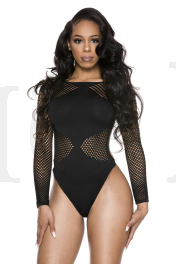 High neckline with back keyhole diamond net teddy with long sleeves and a thong cut back